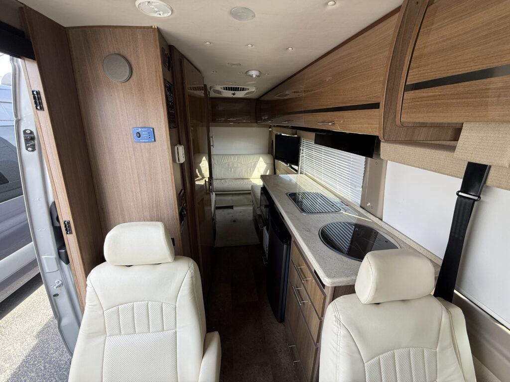 - Interior: Swivel cab seats, LED lighting, MCD blackout roller shades, and a fully equipped galley